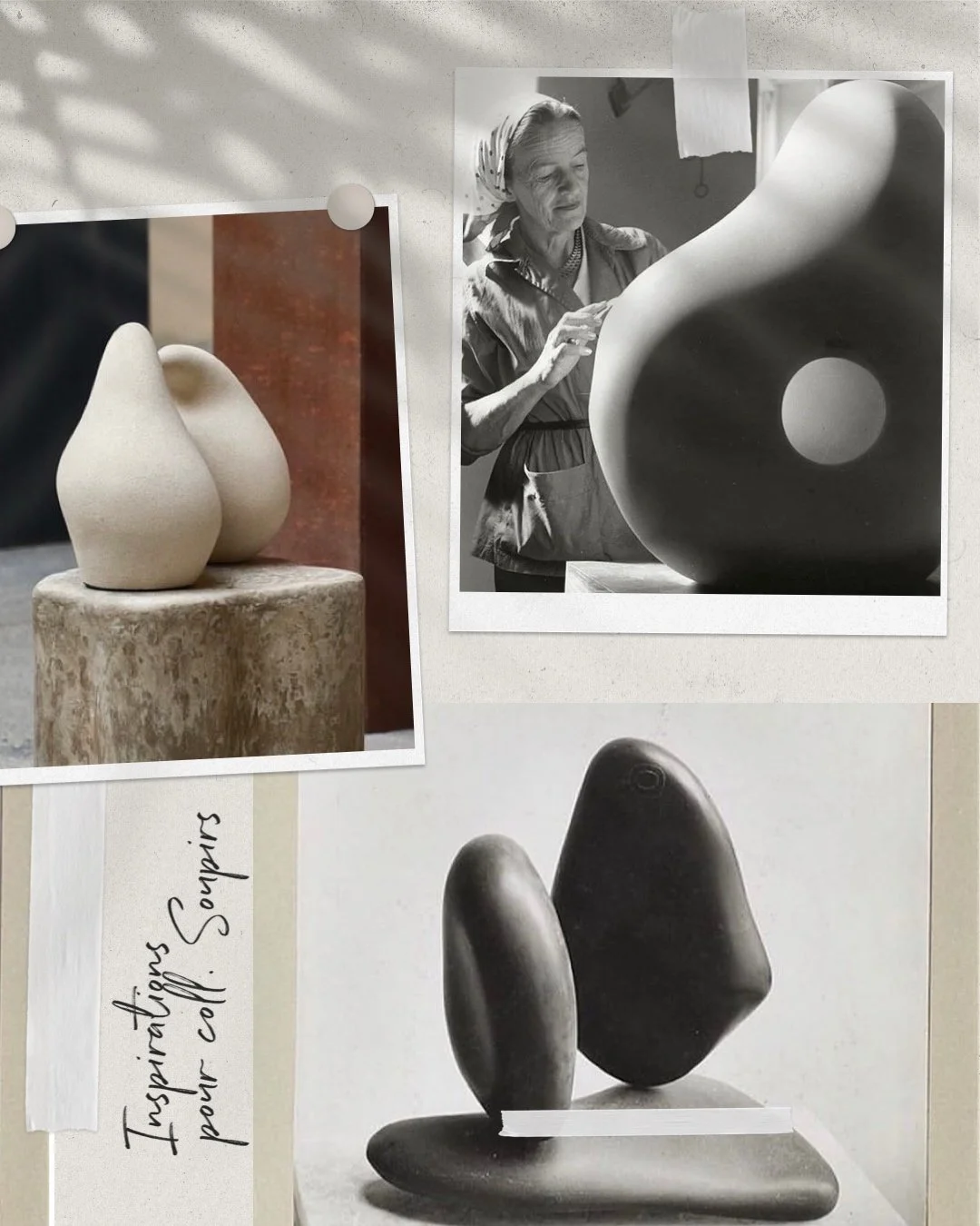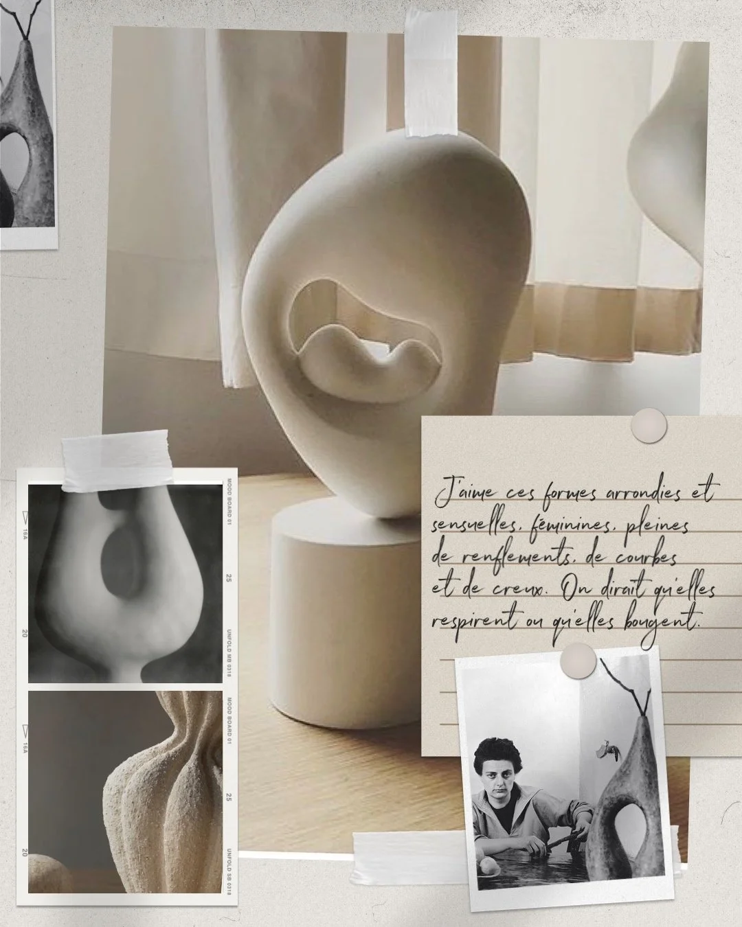 Parmi les images amassées, il y a entre autres les magnifiques sculptures de Barbara Hepworth, Valentine Schlegel, Hermine Bourdin, Simone Bodmer-Turner et Hanna Englund. Des pionnières comme des artistes contemporaines clairement influencées par les deux premières. L’élégance sensuelle de leurs œuvres est puissante. Je trouve absolument fascinantes leurs formes en rondeurs, creux et souplesse. C’est avec ces images en tête et mon désir habituel de fluidité et de mouvement que j’ai travaillé, en tentant de loin et sans prétention de faire écho à leur démarche.